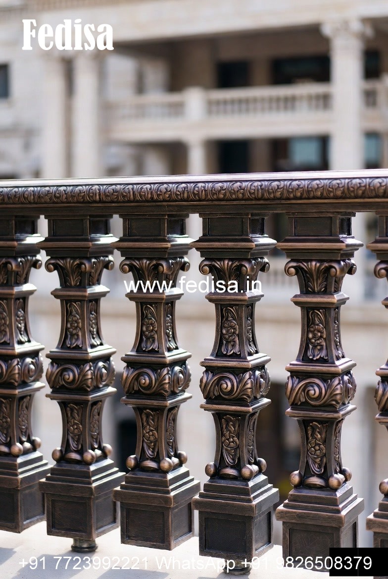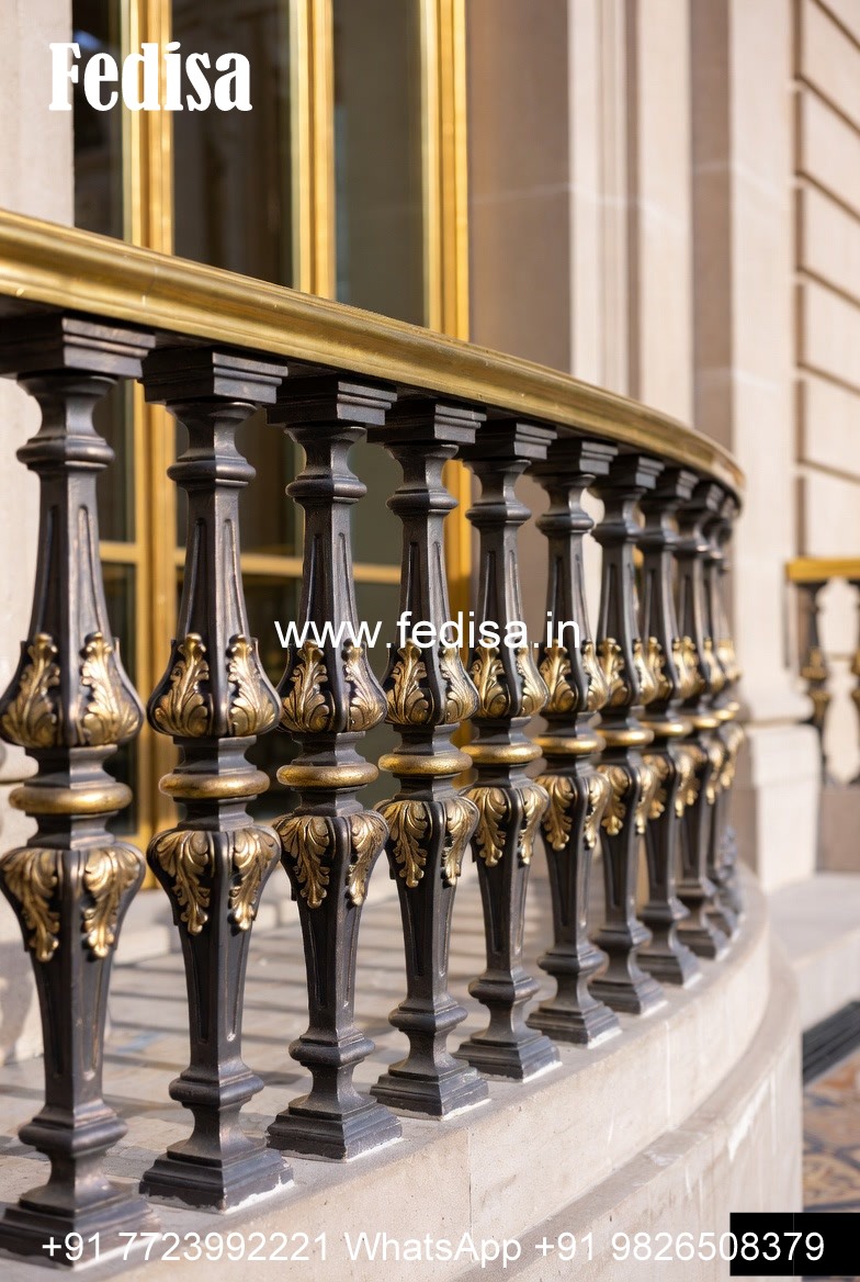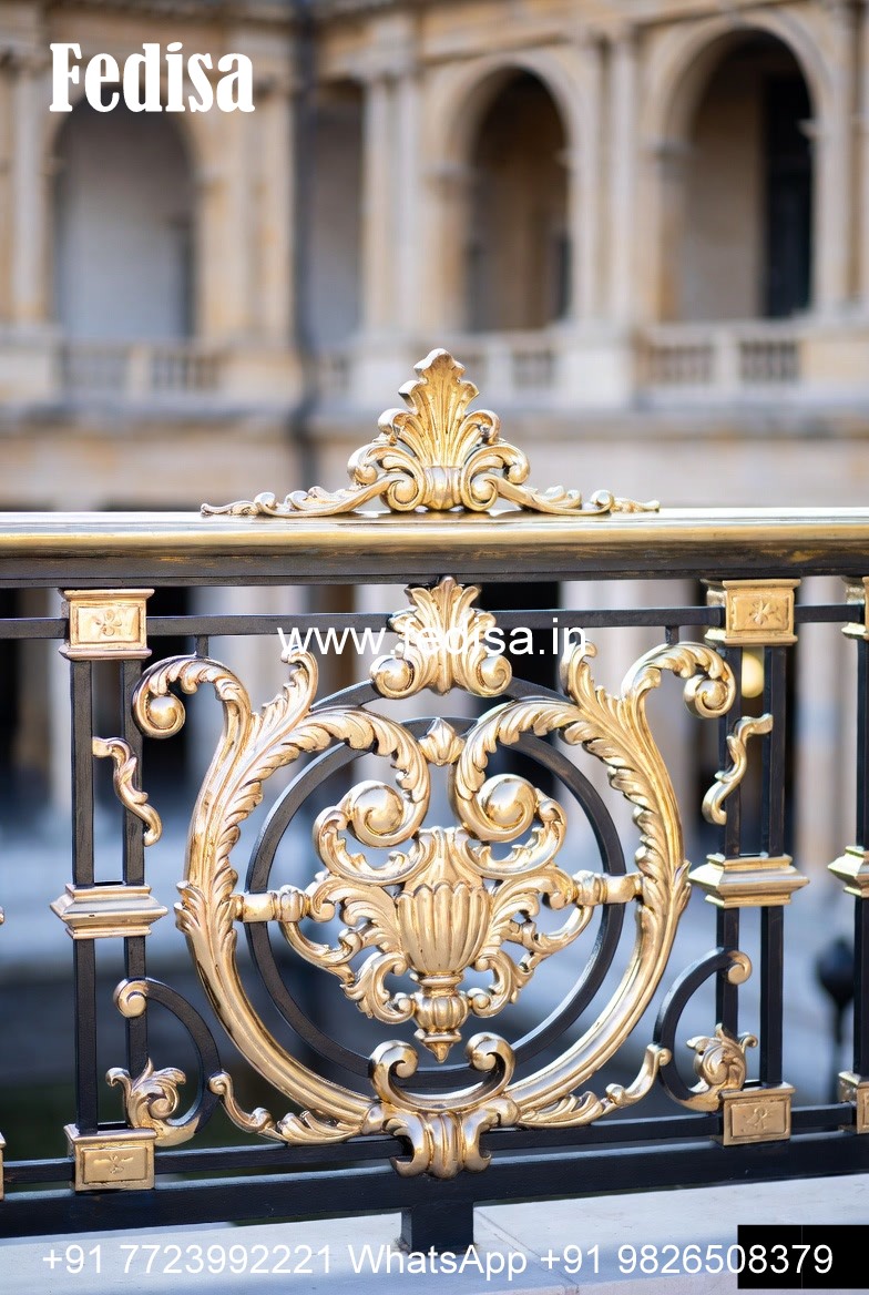 Antique Brass Staircase Railing With Classic Finish Grill Design On Wall