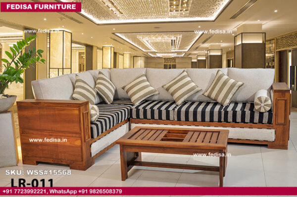 टीकवुड सोफा सेट ऑनलाइन खरीदें एल शेप सोफा ऑनलाइन 9 सीटर सोफा सेट टेबल के साथ ब्लैक फैब्रिक सोफा सेट